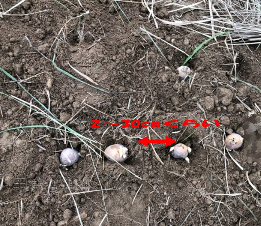 ジャガイモ間隔は2~30センチ、足一つほどを空けるように植えていきます👇