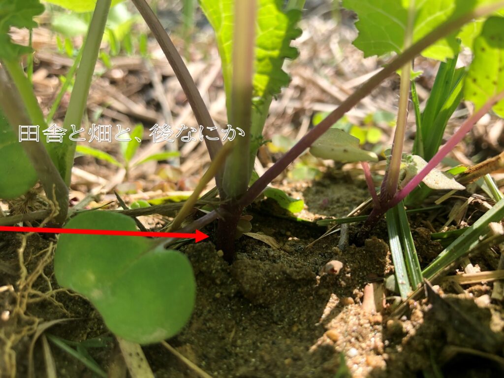 画像の赤い矢印、根の部分ですが成長するにつれ、むき出しになってきたので土寄せはしておきました。もう少し苗が成長したら広い場所へ引っ越し予定ですが、まだまだ育苗中です